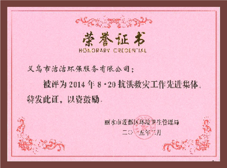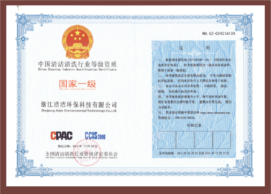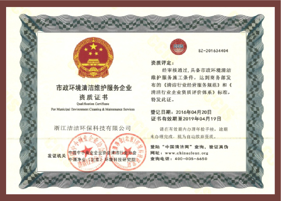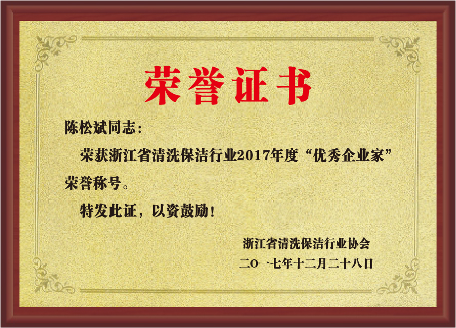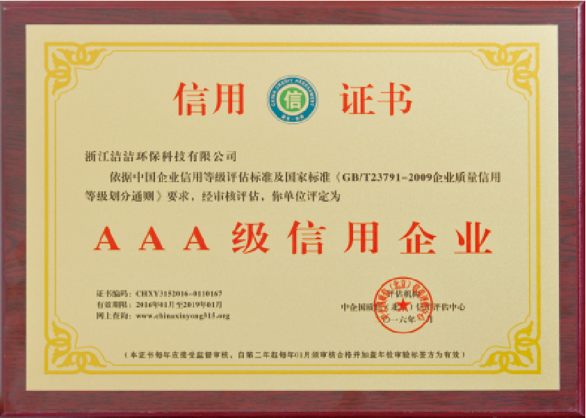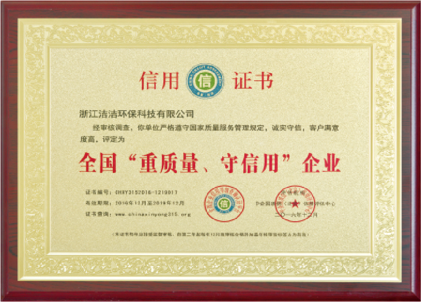 重要榮譽(yù):“全國(guó)信用等級(jí)AAA級(jí)企業(yè)”、全國(guó)“重質(zhì)量、守信 用企業(yè)”、“浙江省質(zhì)量服務(wù)誠(chéng)信AAA級(jí)企業(yè)”、中國(guó)中小商業(yè) 企業(yè)協(xié)會(huì)清潔行業(yè)分會(huì)常務(wù)理事員會(huì)單位